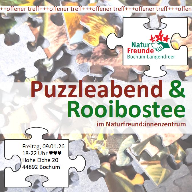 Puzzle raus und los geht’s. Wir haben ein paar Puzzle da und ihr könnte gerne Puzzle mitbringen. Es gibt Suppe und Tee. Alter: 0 bis 121 Schwierigkeit: 0 bis 10