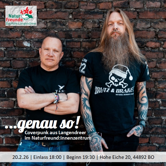 Die Jungs covern von Ärzte bis Udo Lindenberg und haben auch eigene Songs im Gepäck! Spaßmusik vom feinsten im Naturfreund:innenzentrum! Einlass: 18:00, Beginn: 19:30 Matthias: Gesang, Bass und bässer, Sven: […]