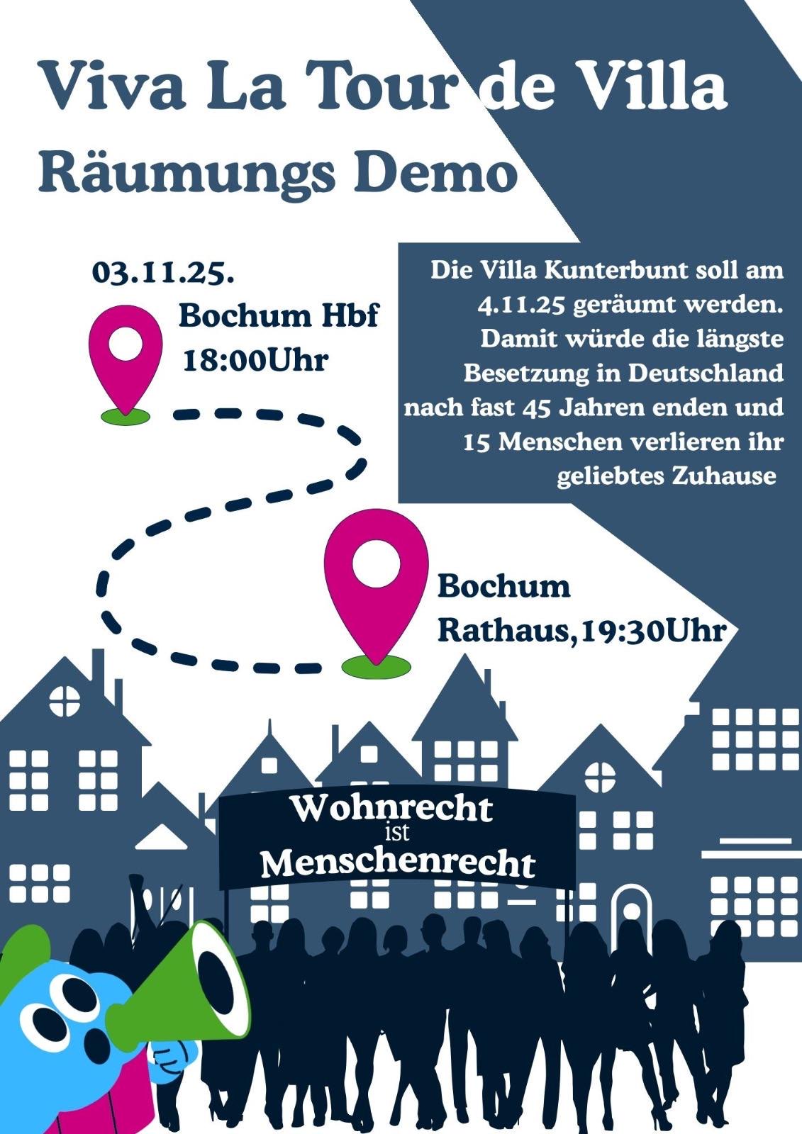 Naturfreunde Langendreer solidarisch mit Villa Kunterbunt Die Nachricht, dass die Villa Kunterbunt (Auf den Holln 3) geräumt werden soll, hat uns erschüttert. Mit einer Frist von nur 10 Tagen soll die Villa aufgrund von in einem Gutachten festgestellten Baumängeln, die das Haus angeblich unbewohnbar machen, freigezogen werden. Eigentümer der denkmalgeschützen Immobilie ist die Stadt Bochum, […] |